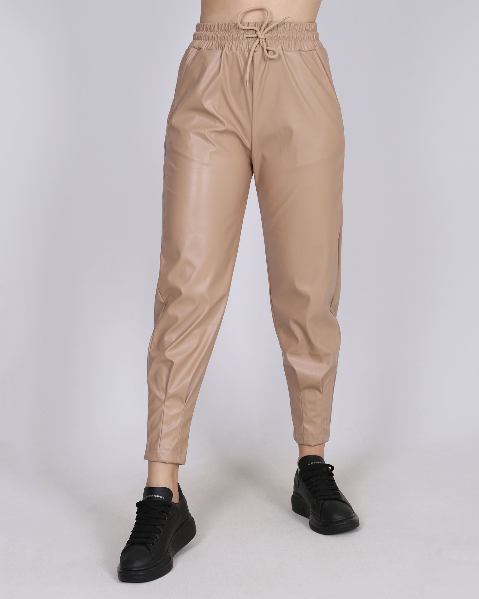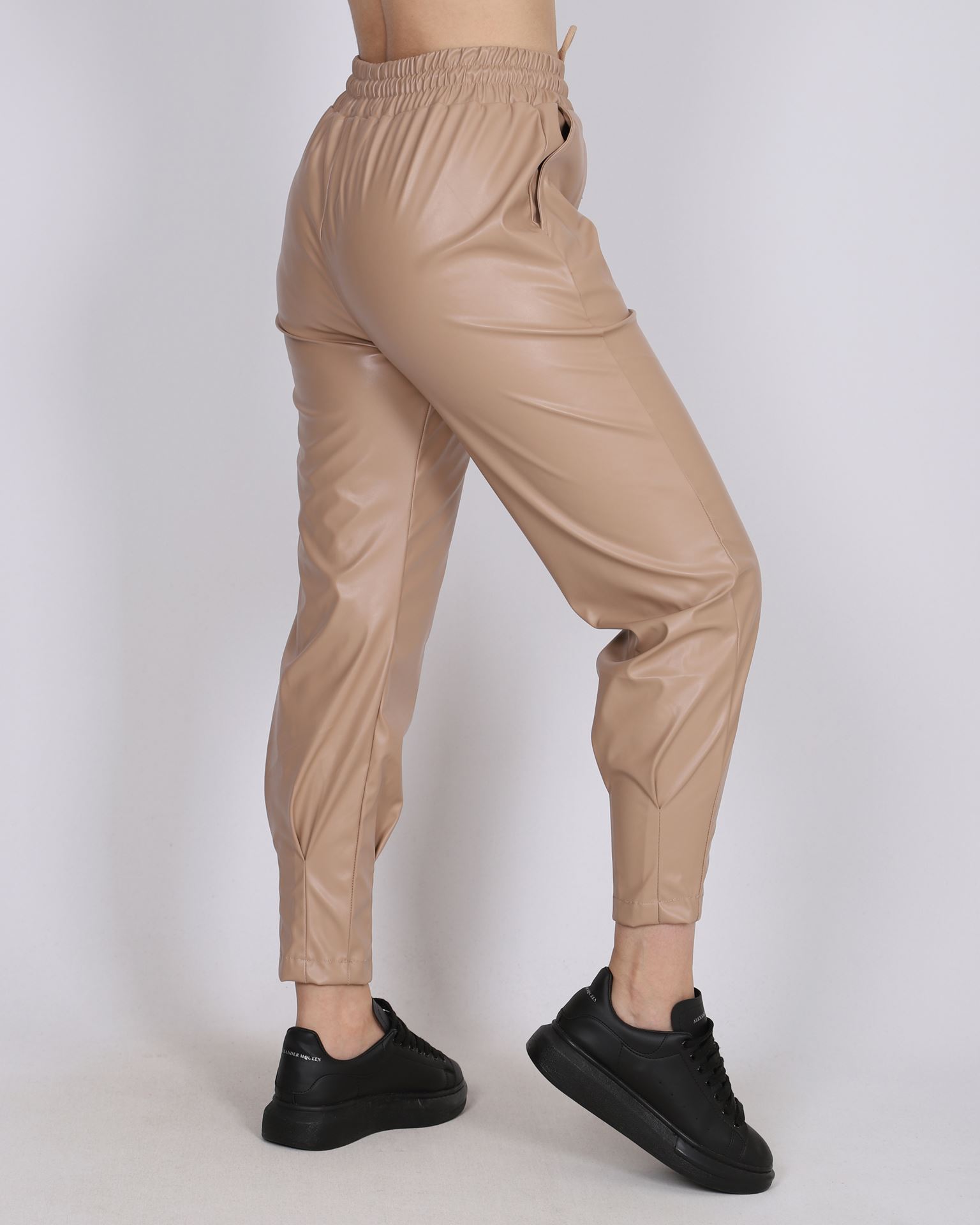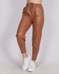 Bej Beli Lastikli Deri Pantolon PNT493