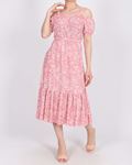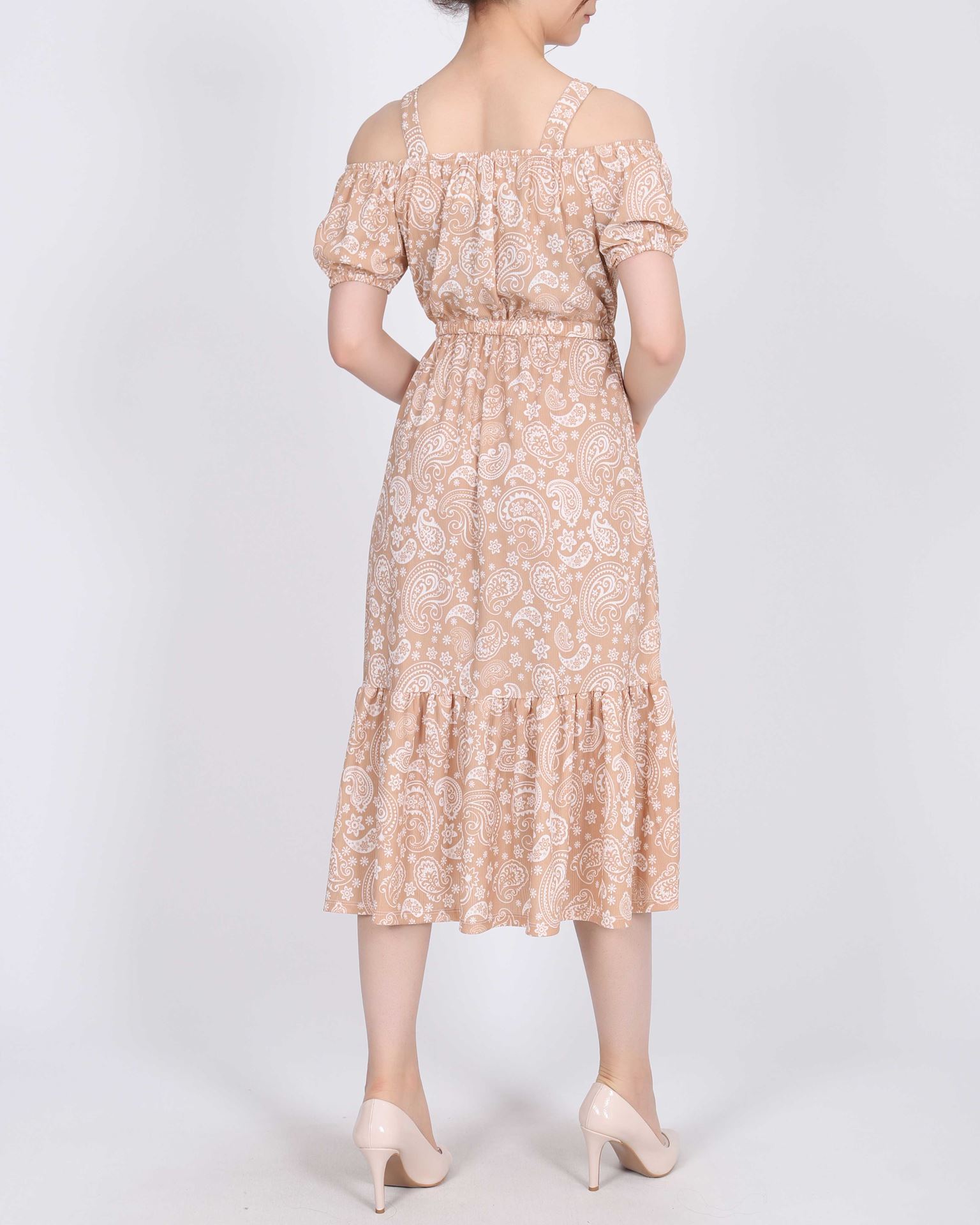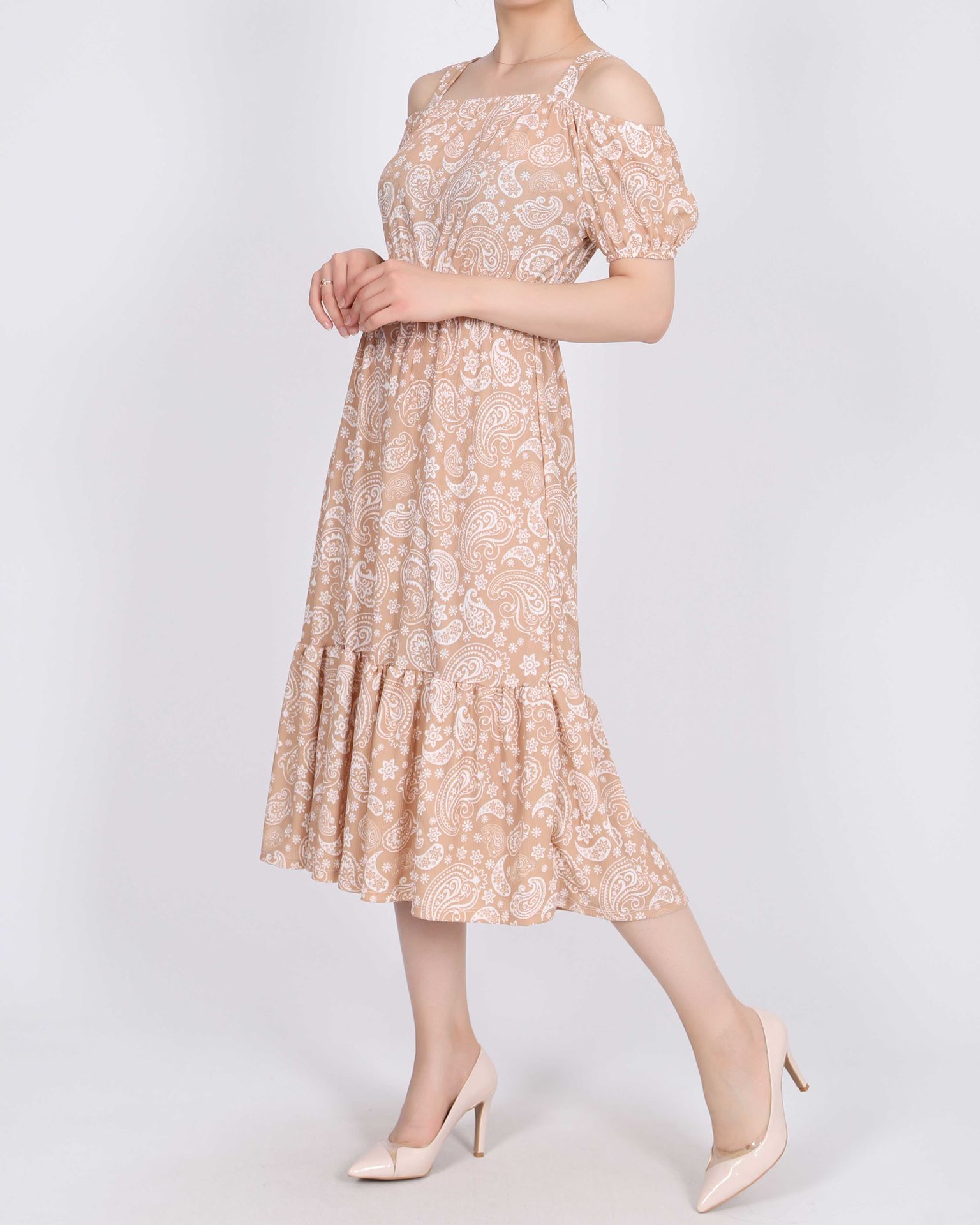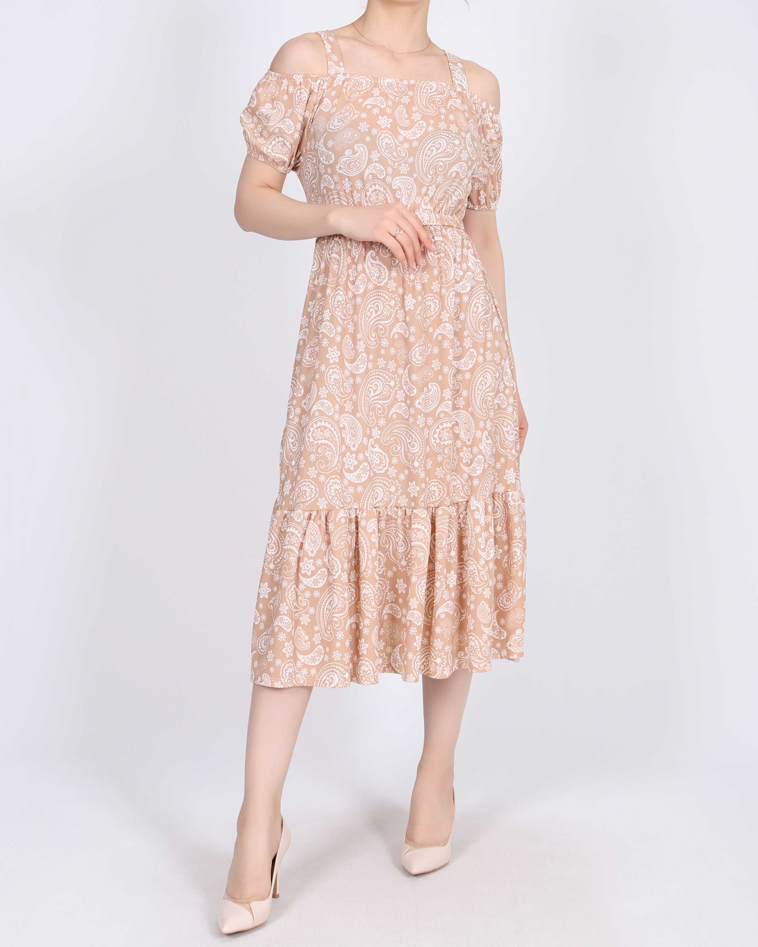 Bej Beli Lastikli Krinkıl Elbise ELB863