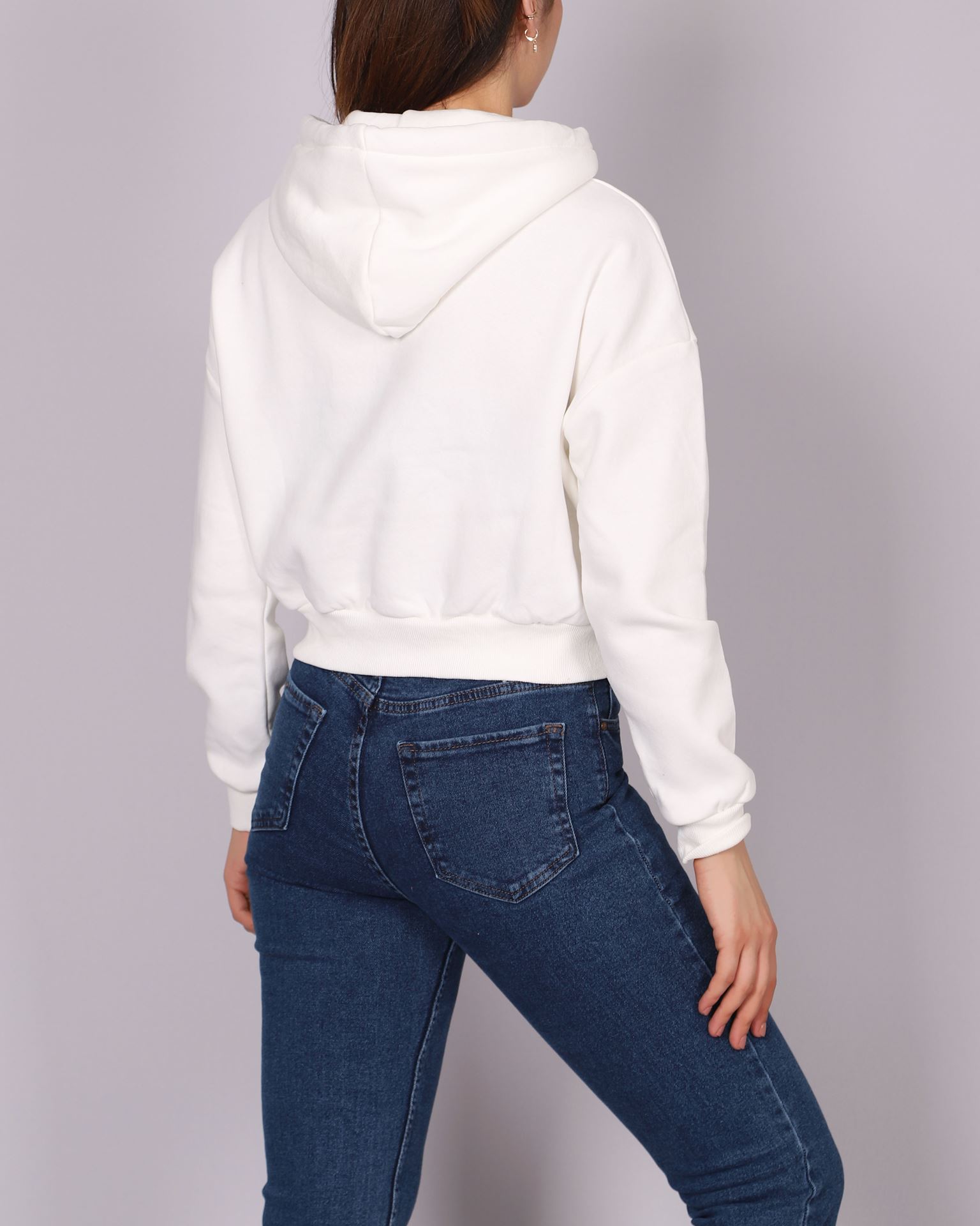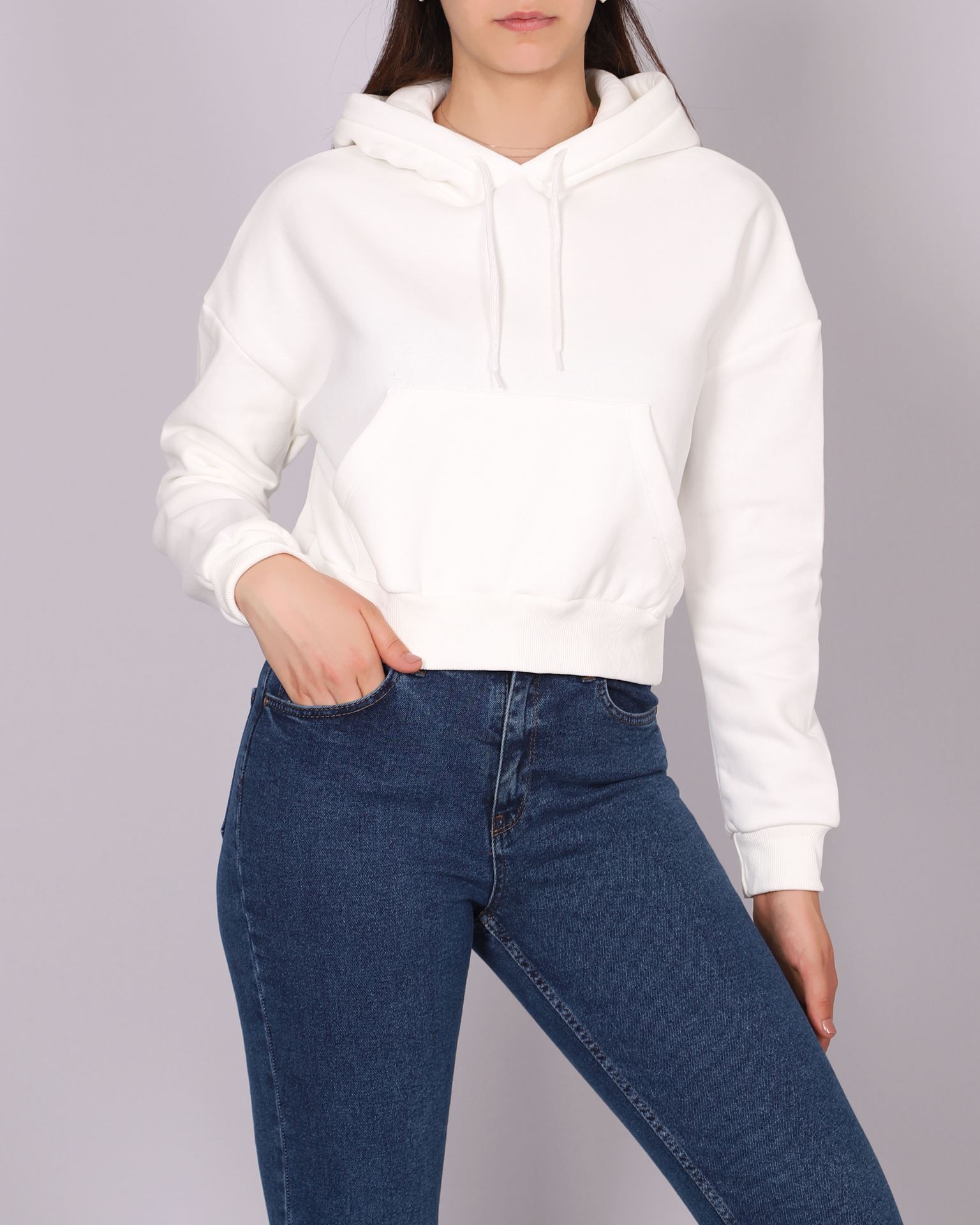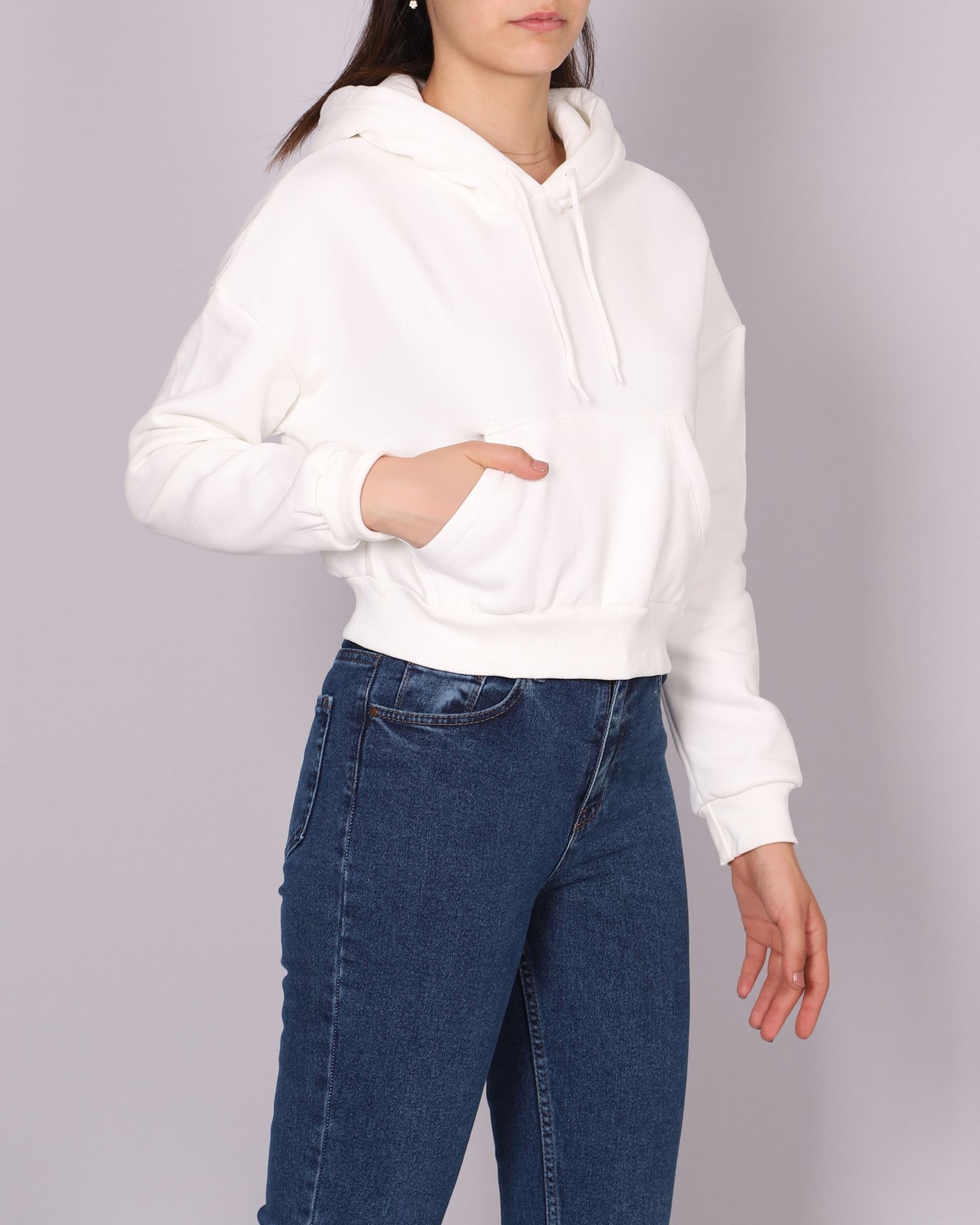 Beyaz Şardonlu Kanguru Cep Crop Sweat SWT964