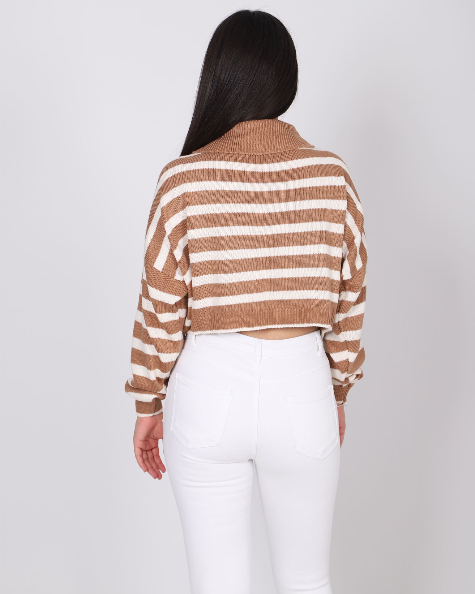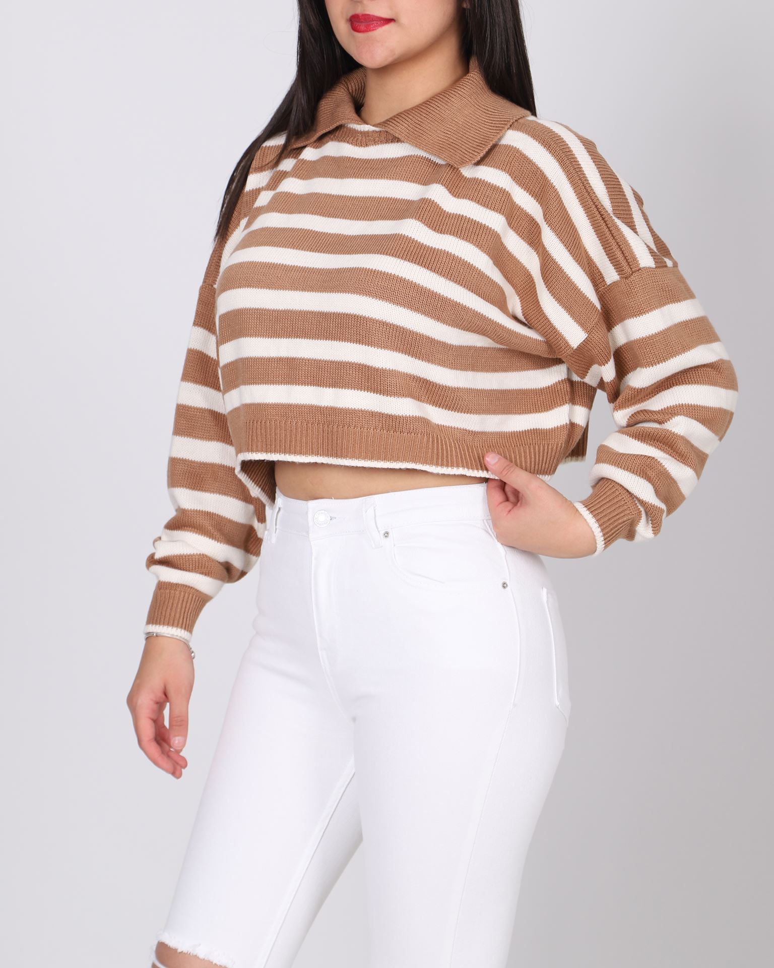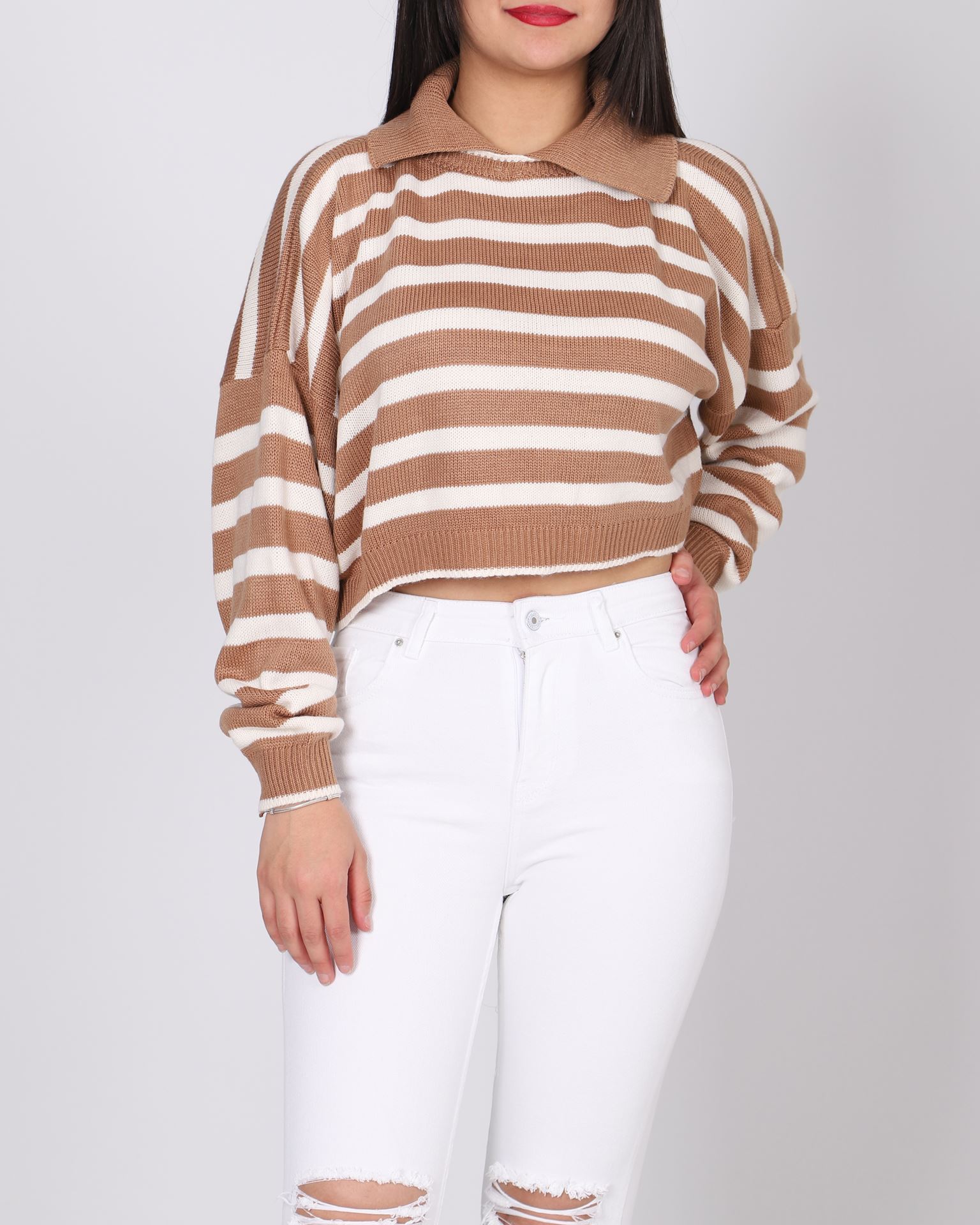 Kahverengi Gömlek Yaka Çizgili Triko Kazak KZK655