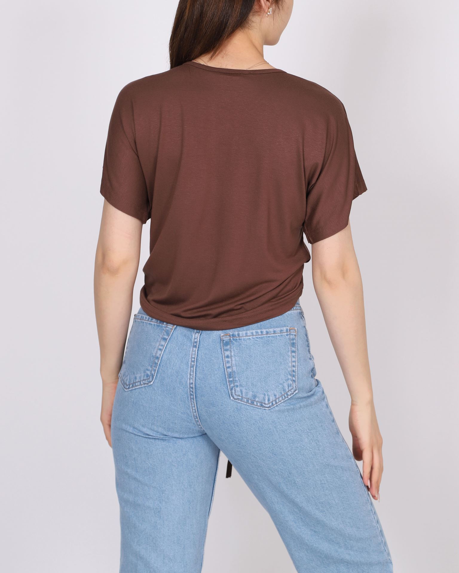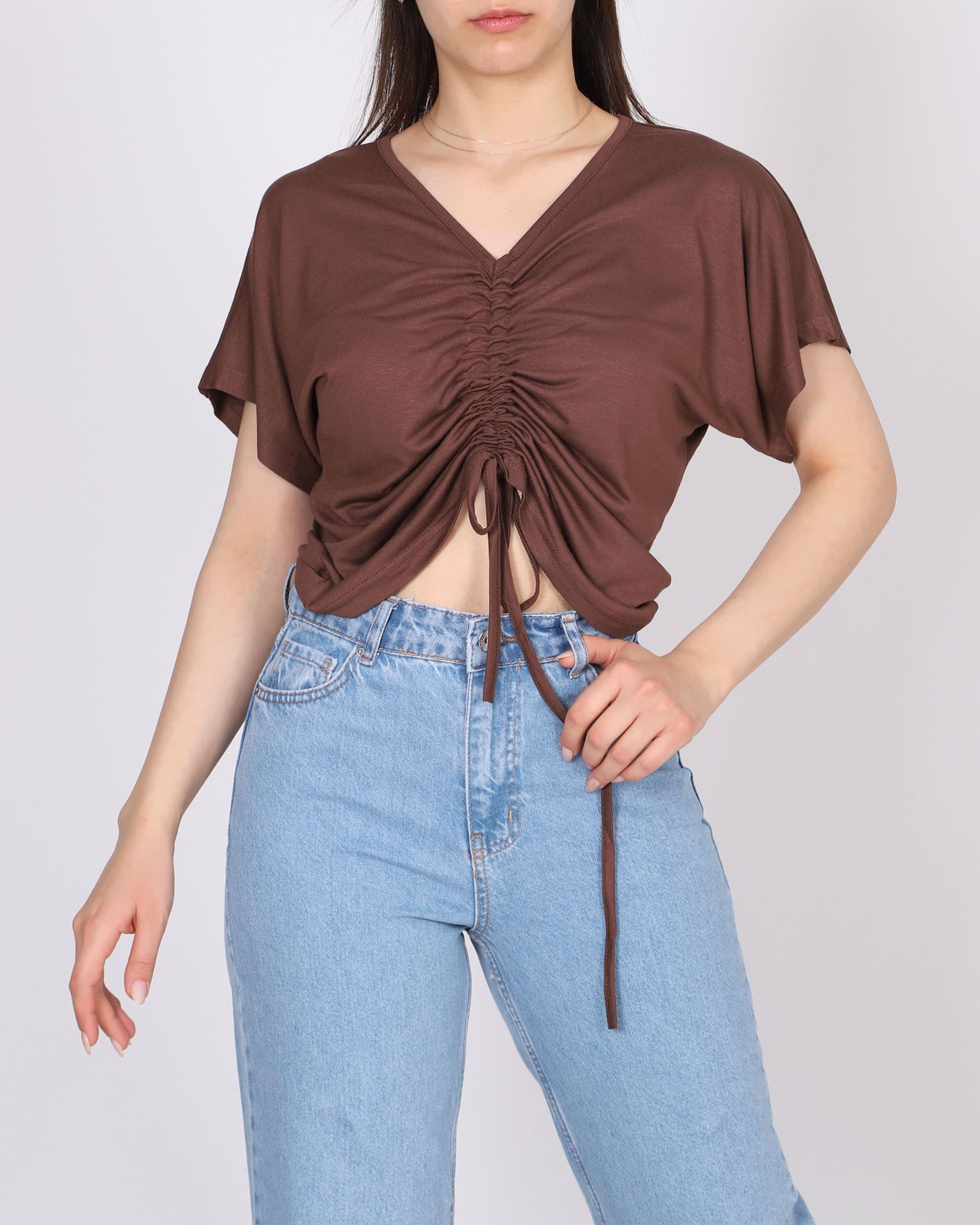 Kahverengi Önü Büzgülü V Yaka Bluz BLZ238