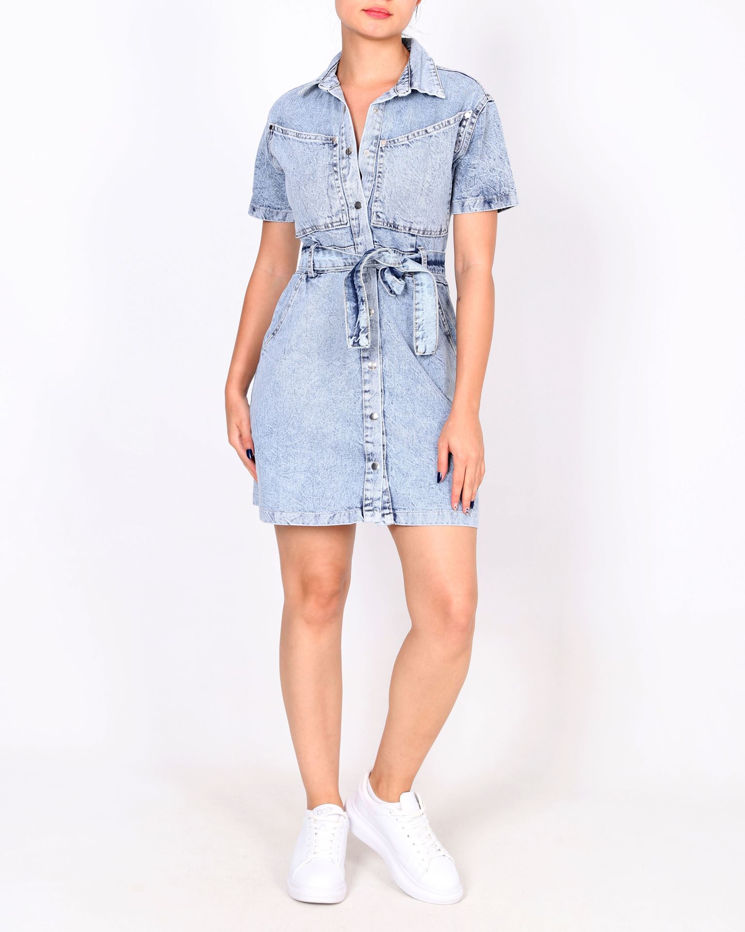 Kar Yıkama Kemerli Kot Elbise ELB1051