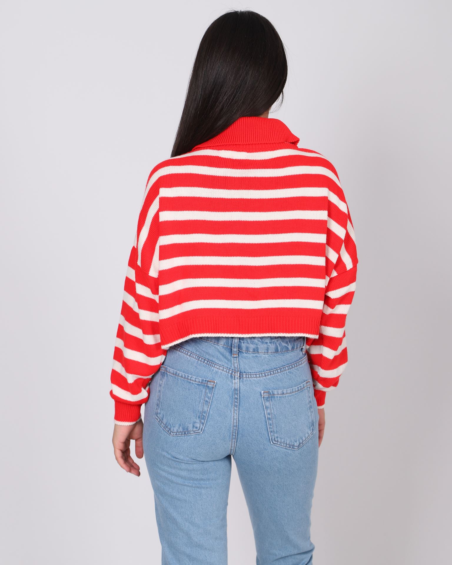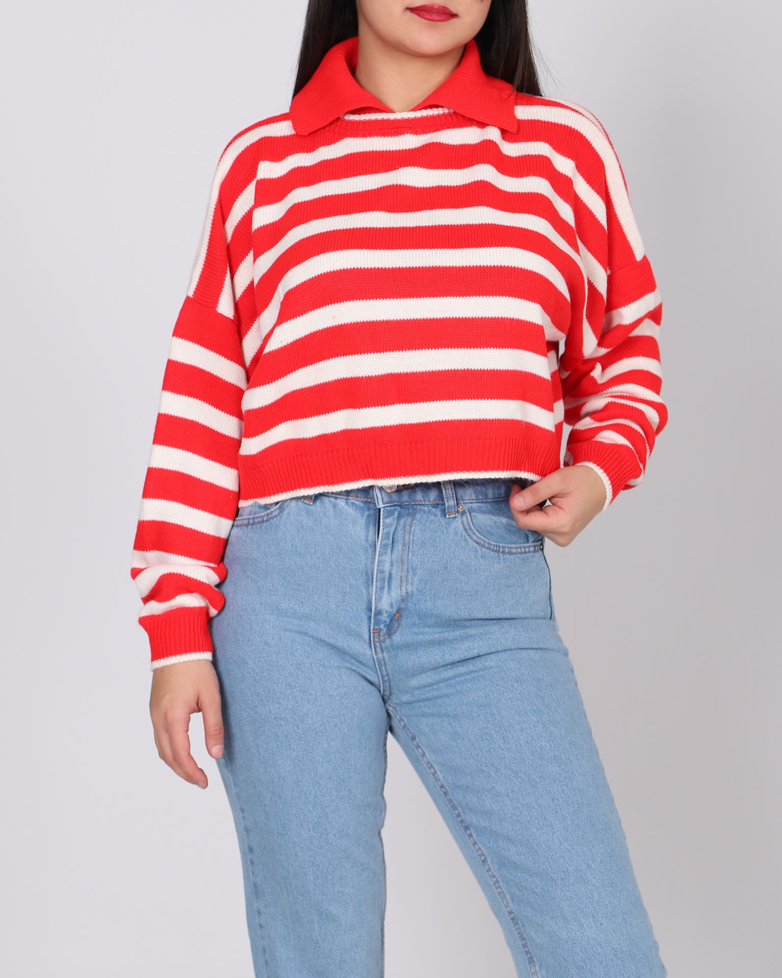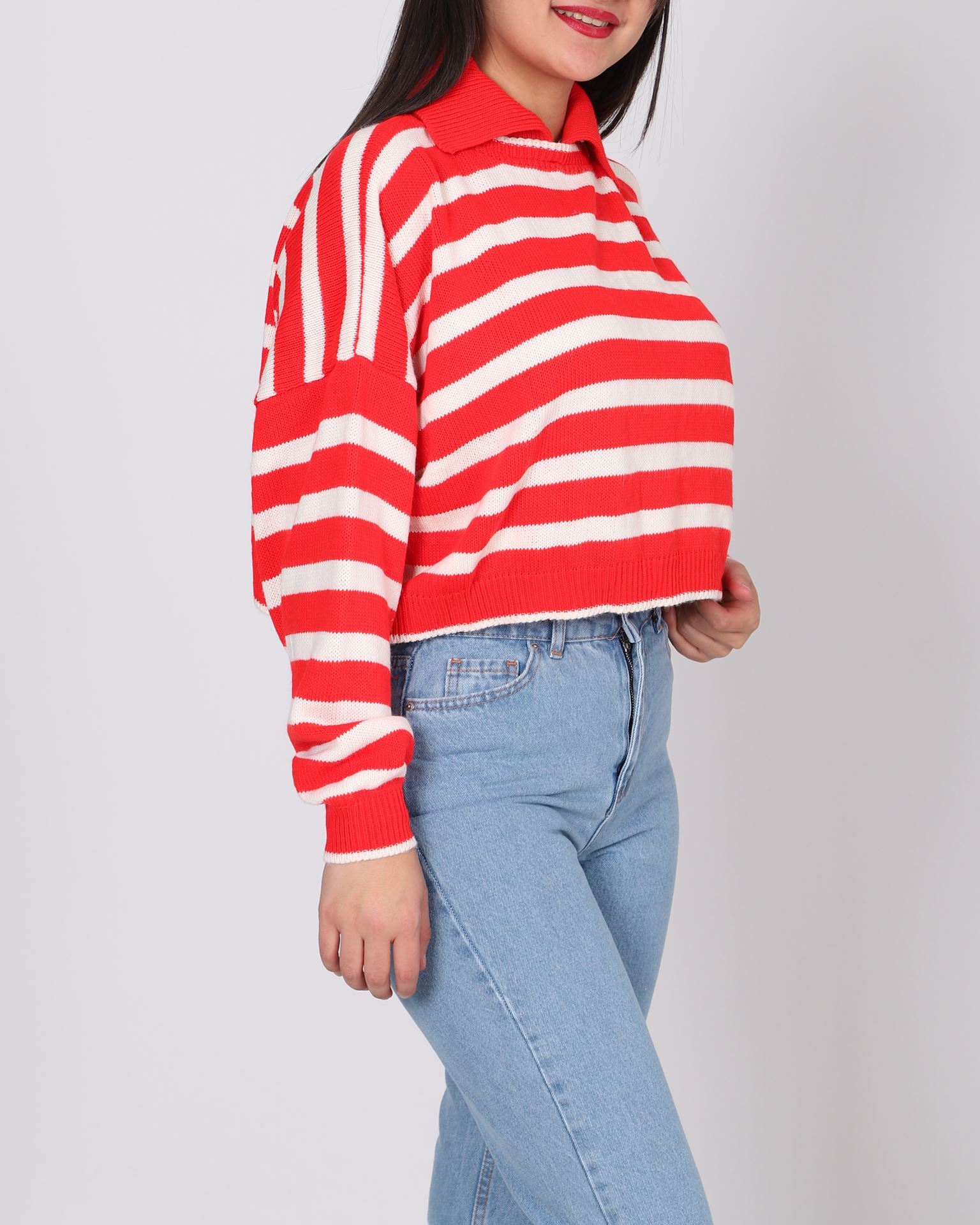 Kırmızı Gömlek Yaka Çizgili Triko Kazak KZK654