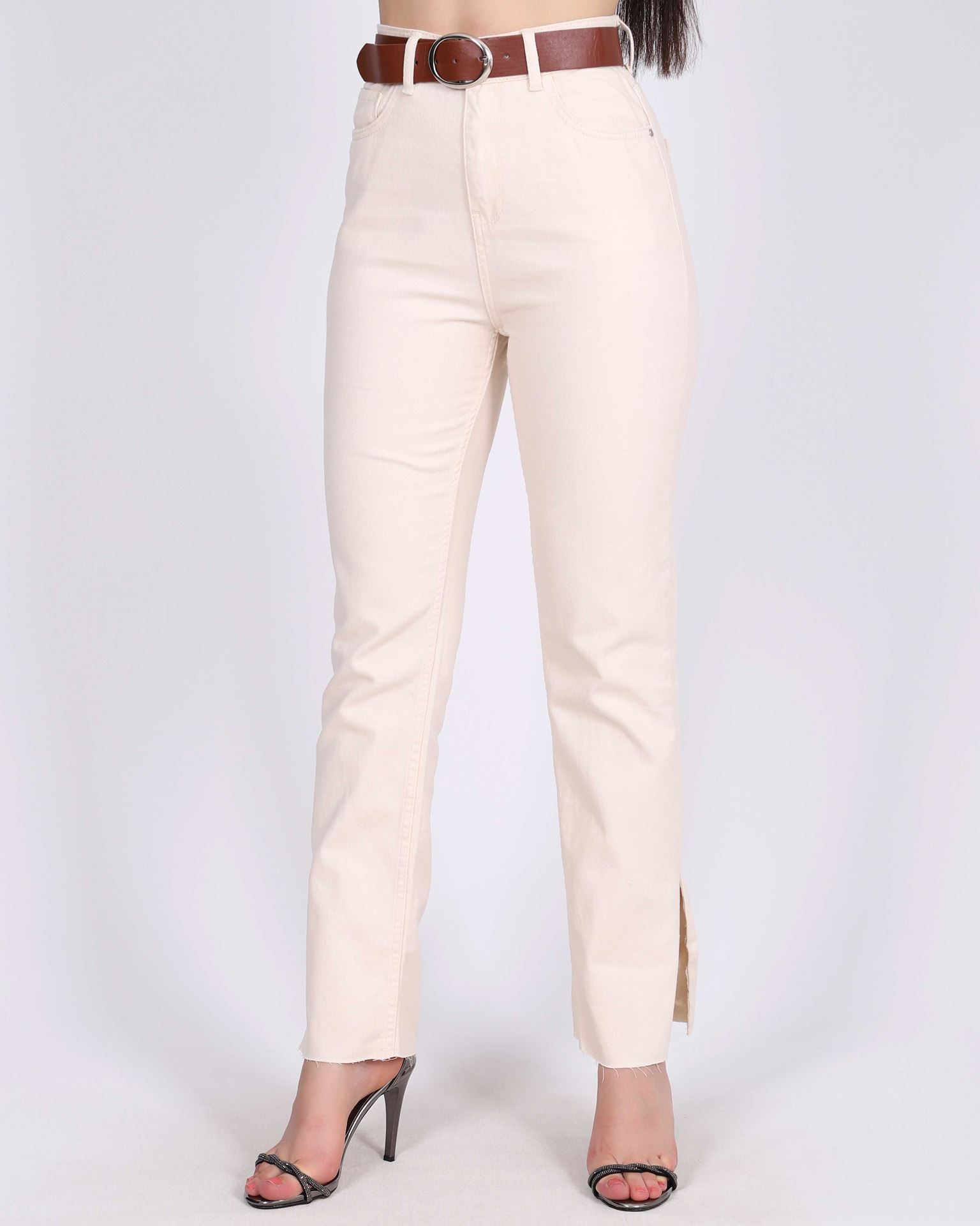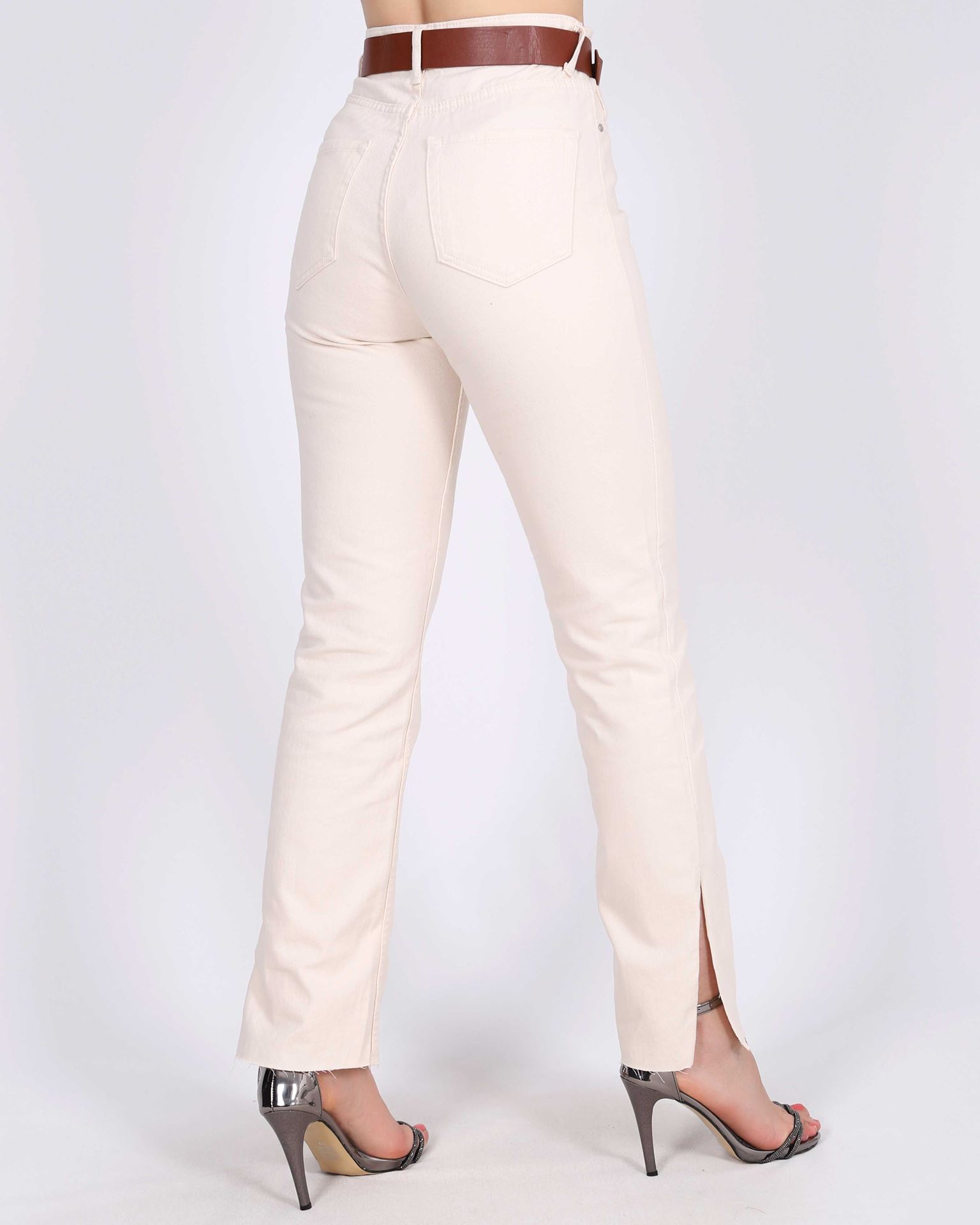 Krem Kemerli Yırtmaçlı Jean PNT427