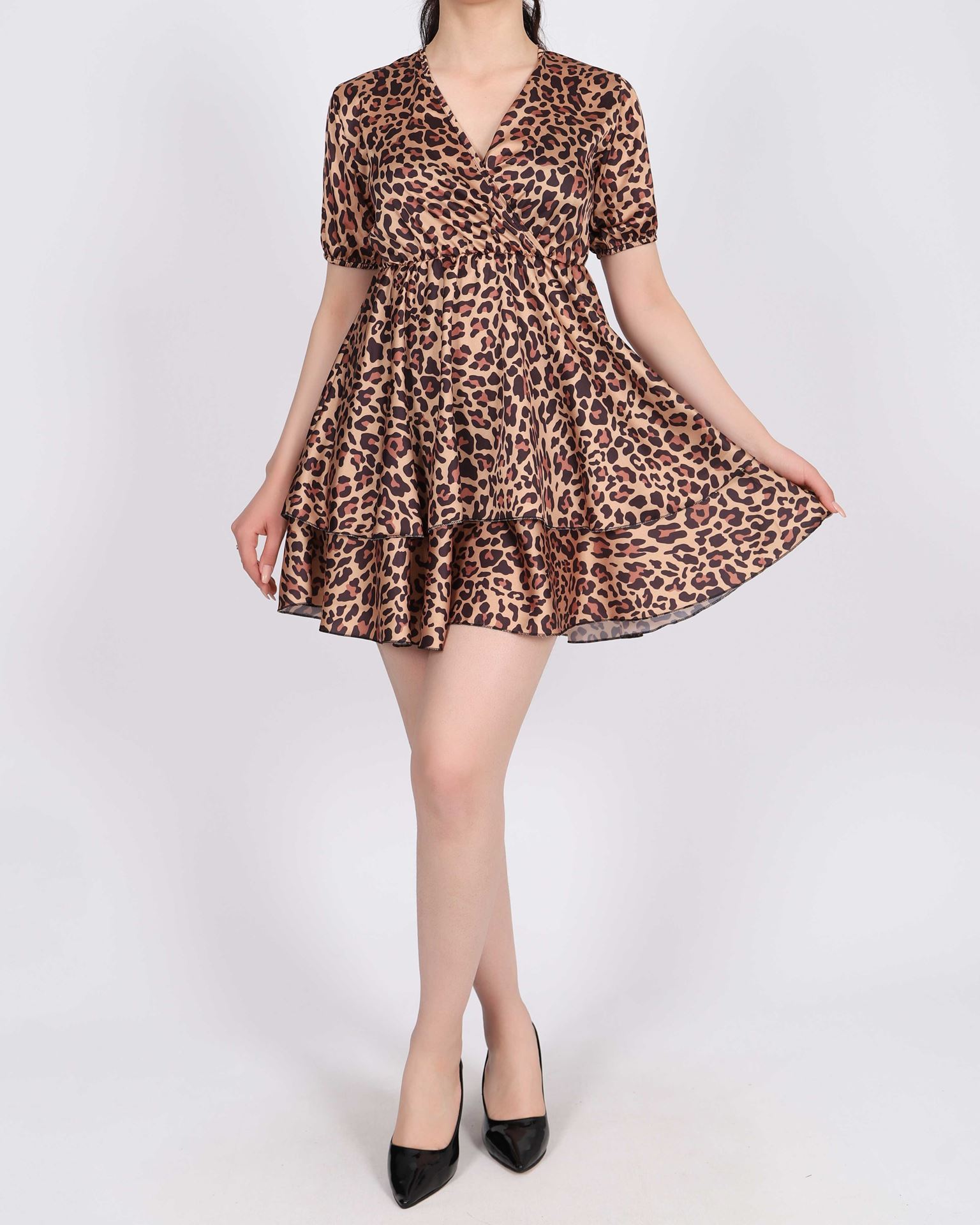 Leopar Desenli Kat Kat Volanlı Saten Elbise ELB806