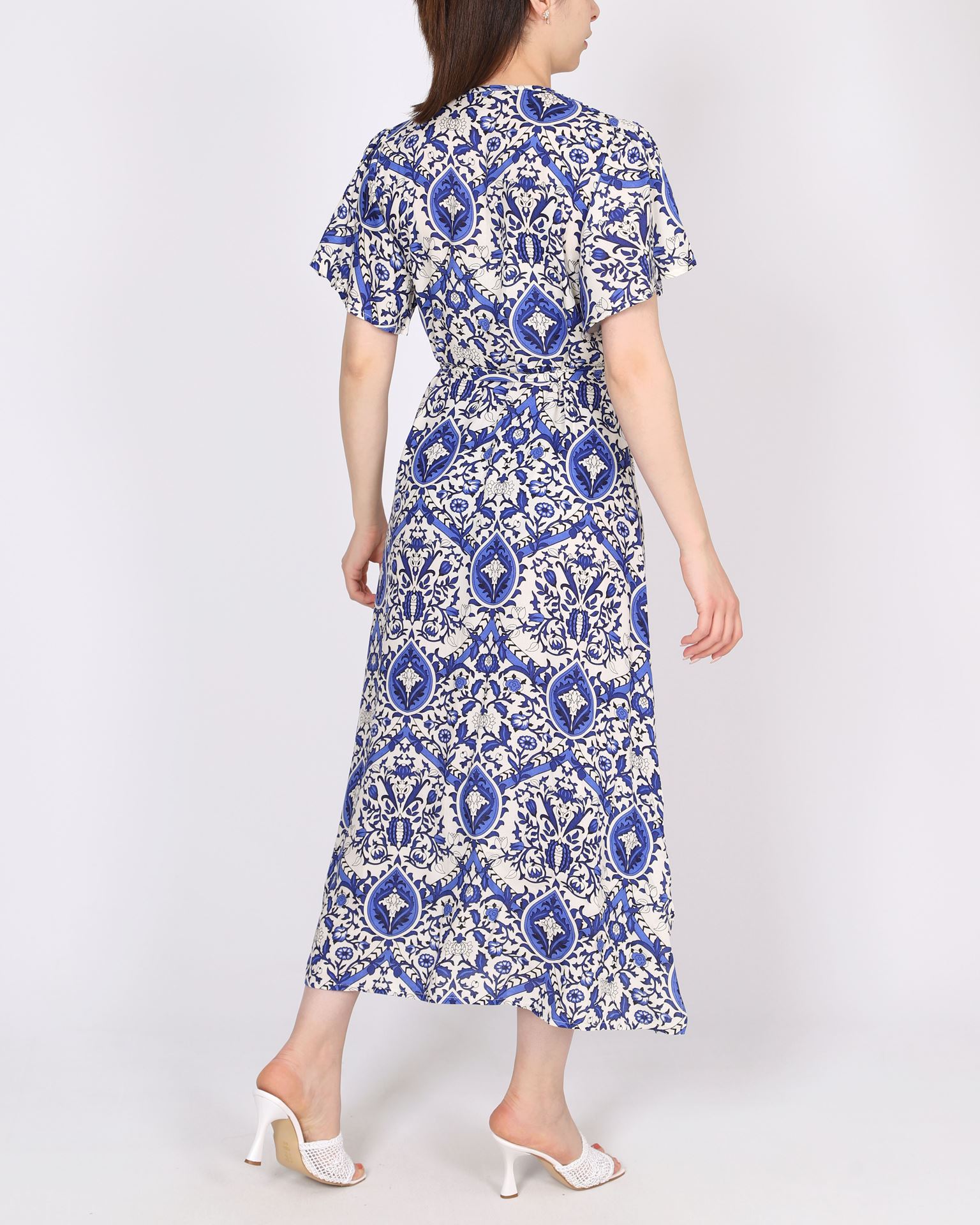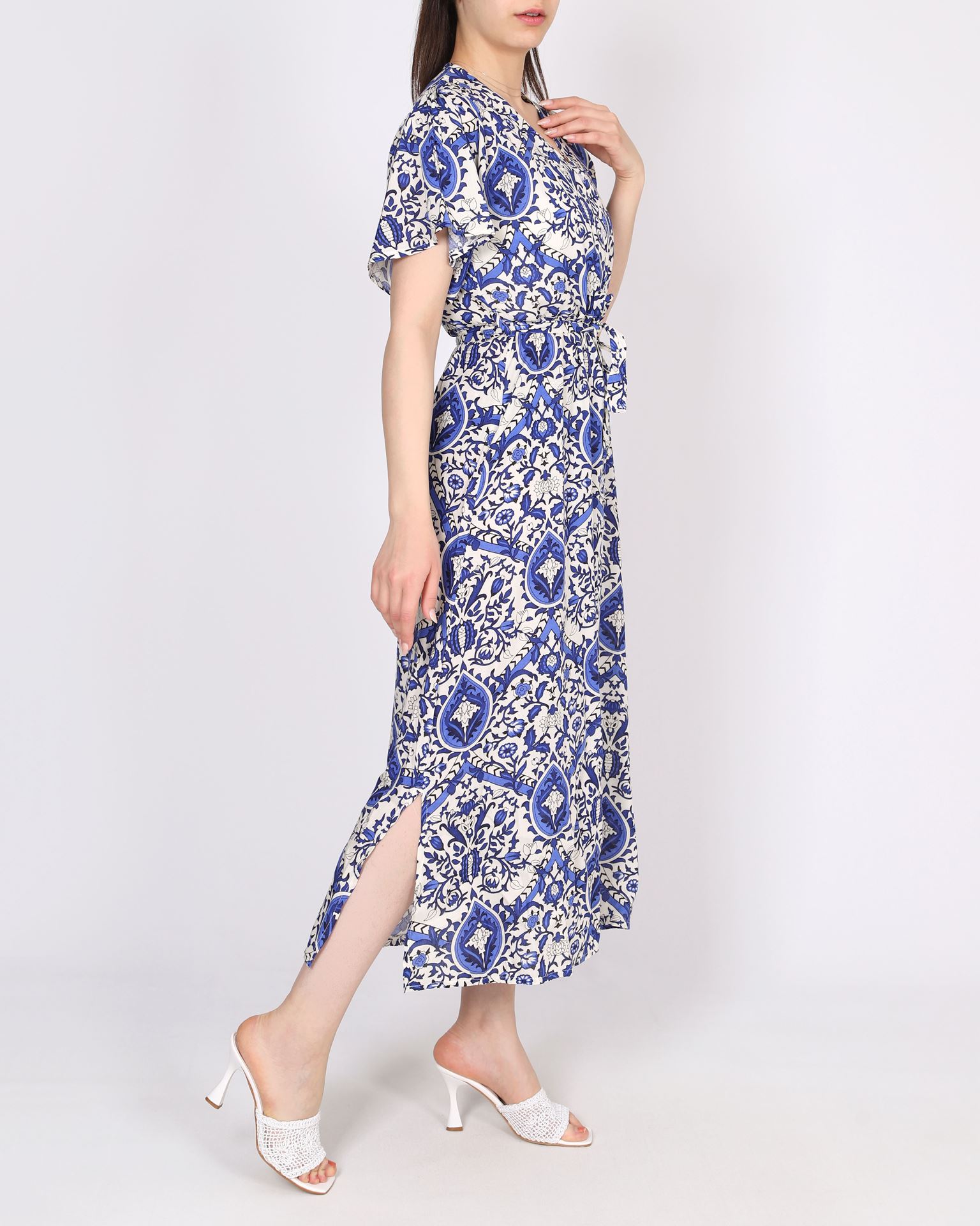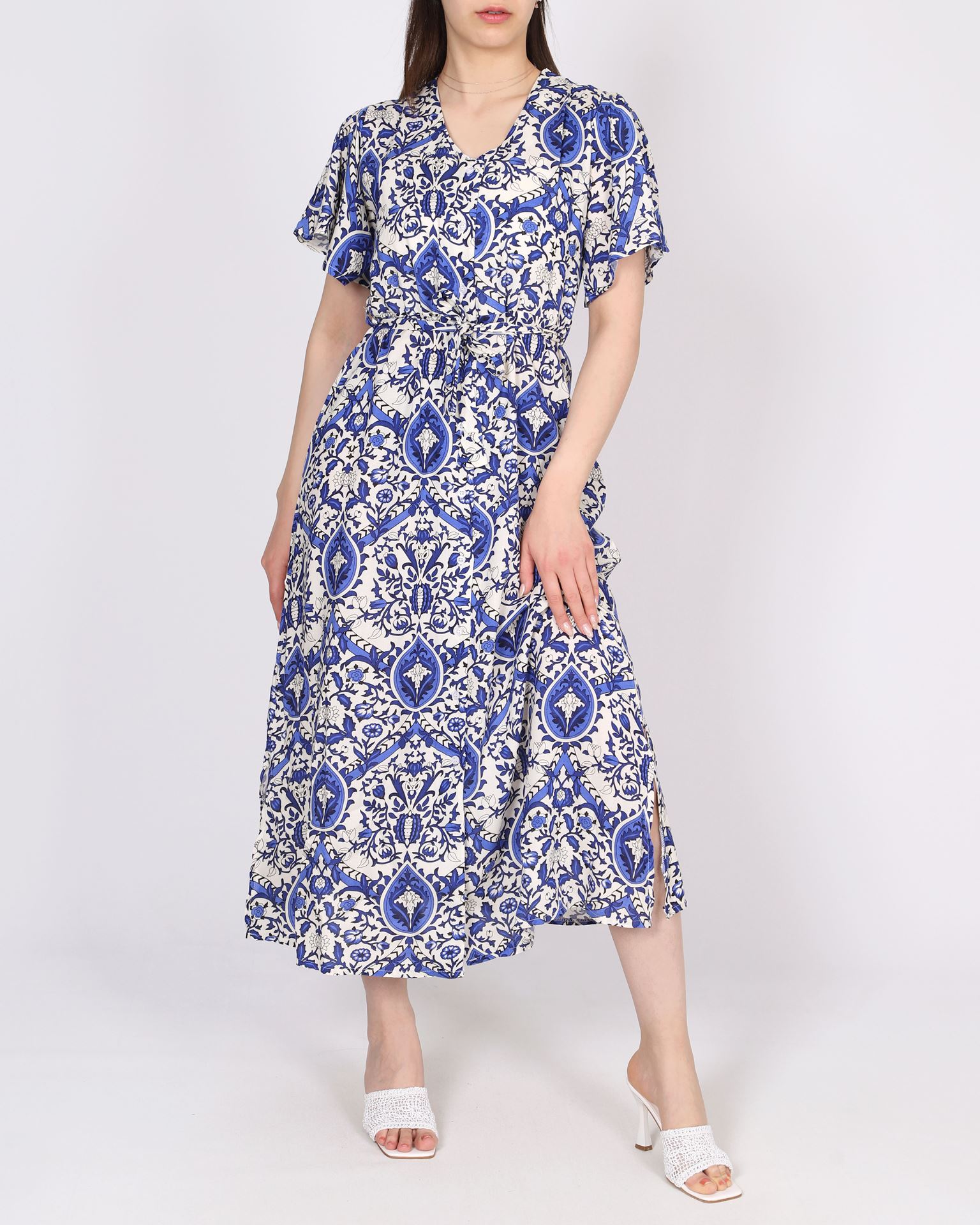 Mavi Desenli Yırtmaçlı Elbise ELB1009
