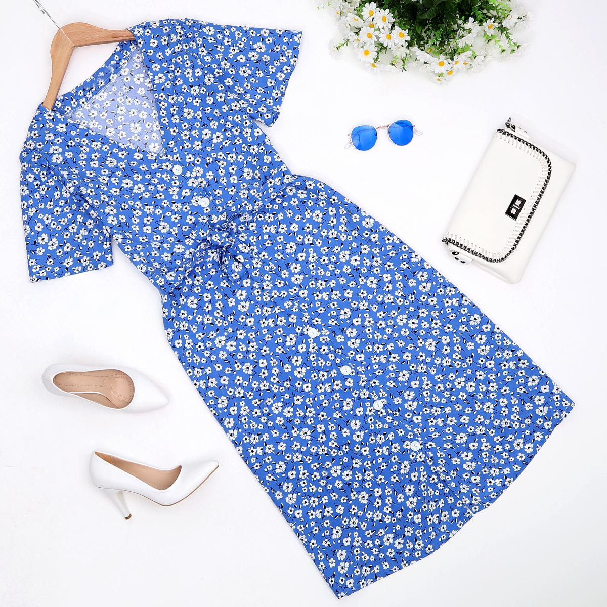 Mavi Düğmeli Çiçekli Elbise ELB339 Ürün Özellikleri
