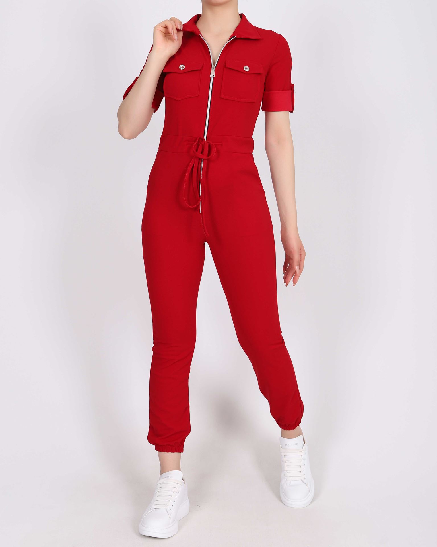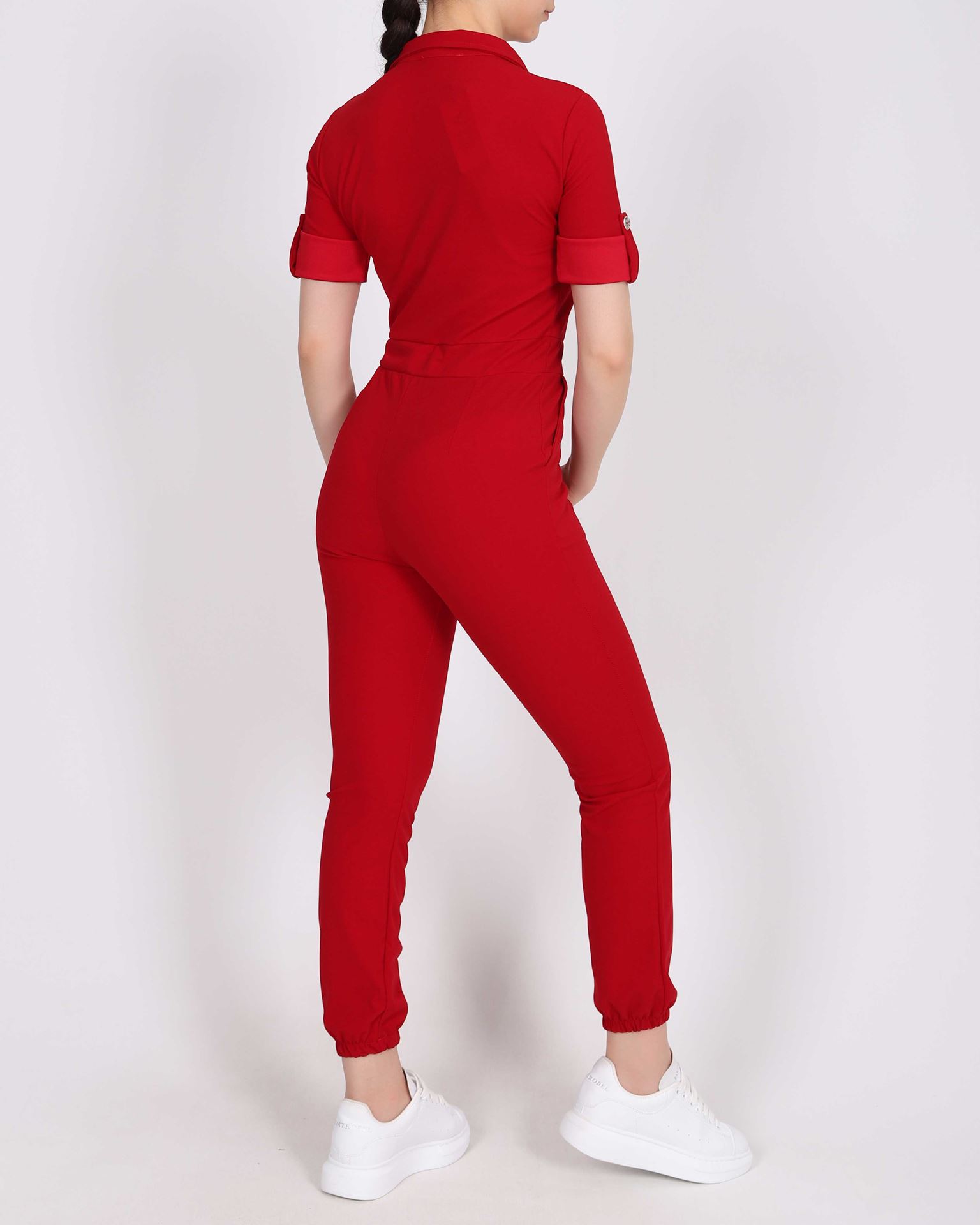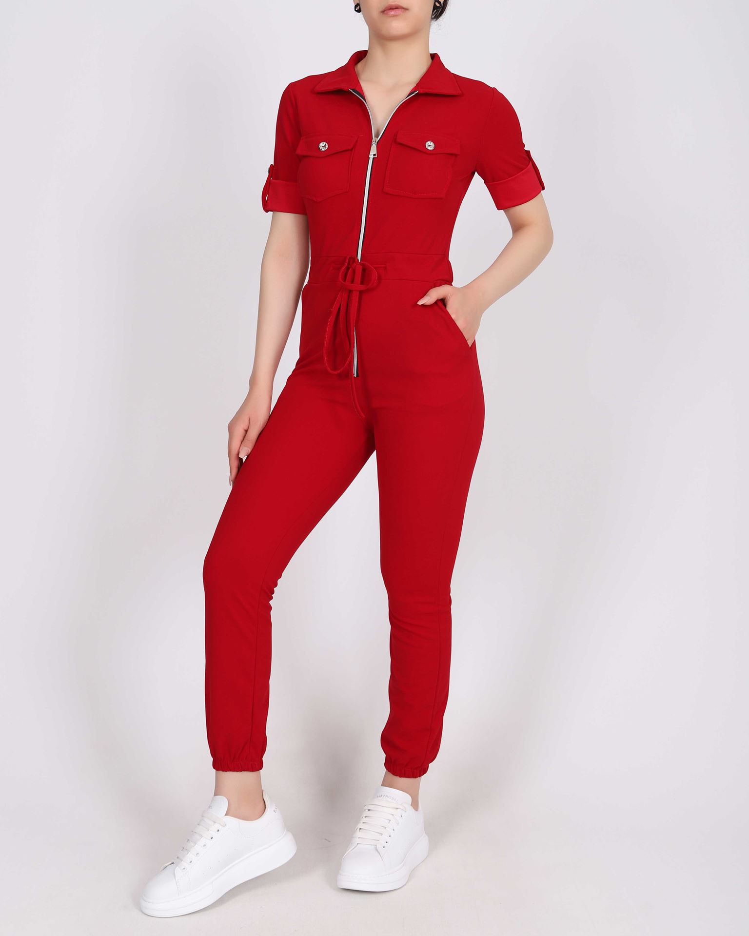 Kırmızı Fermuarlı Kol Bağlamalı Tulum TLM337
