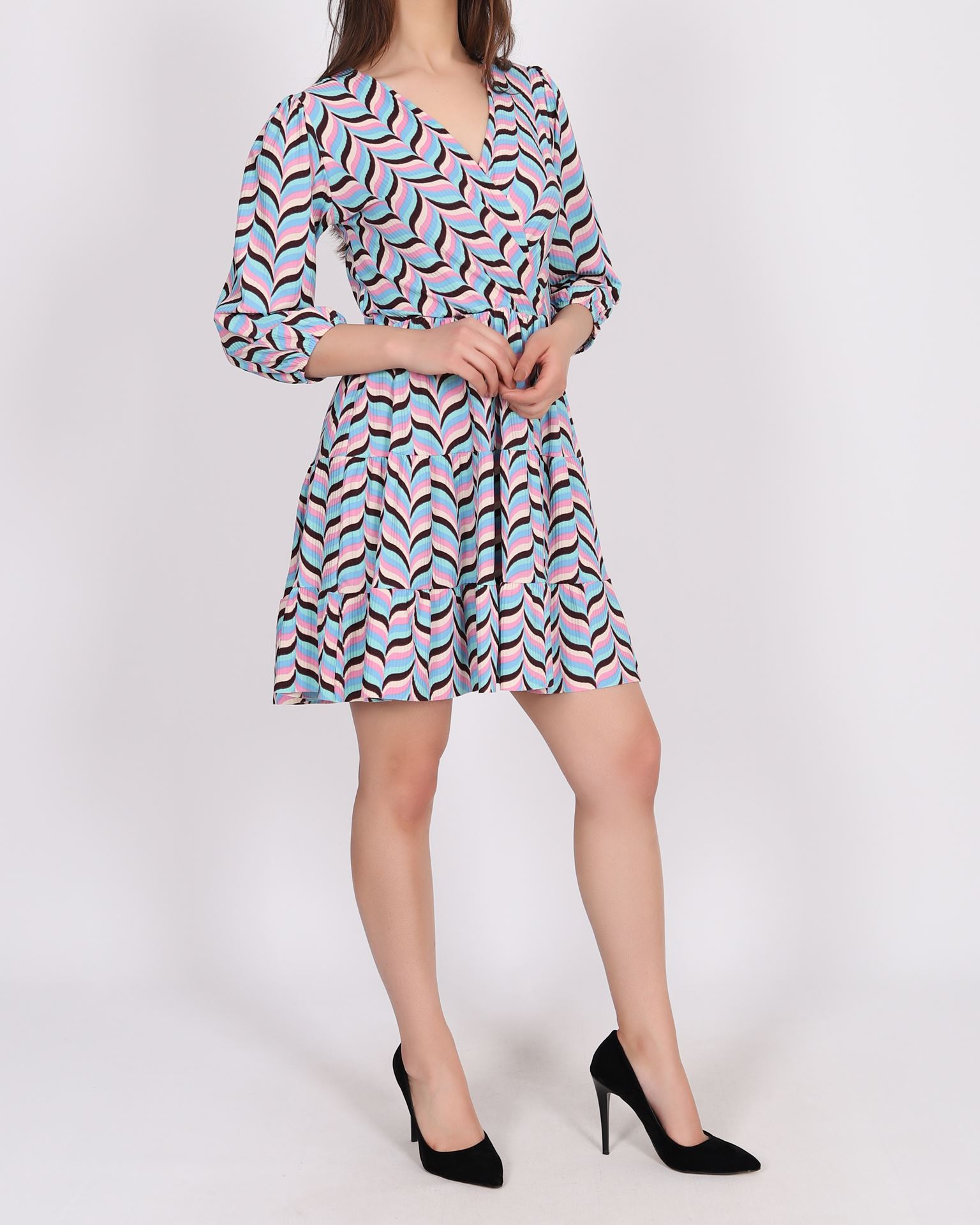 Renkli Kruvaze Yaka Elbise ELB786