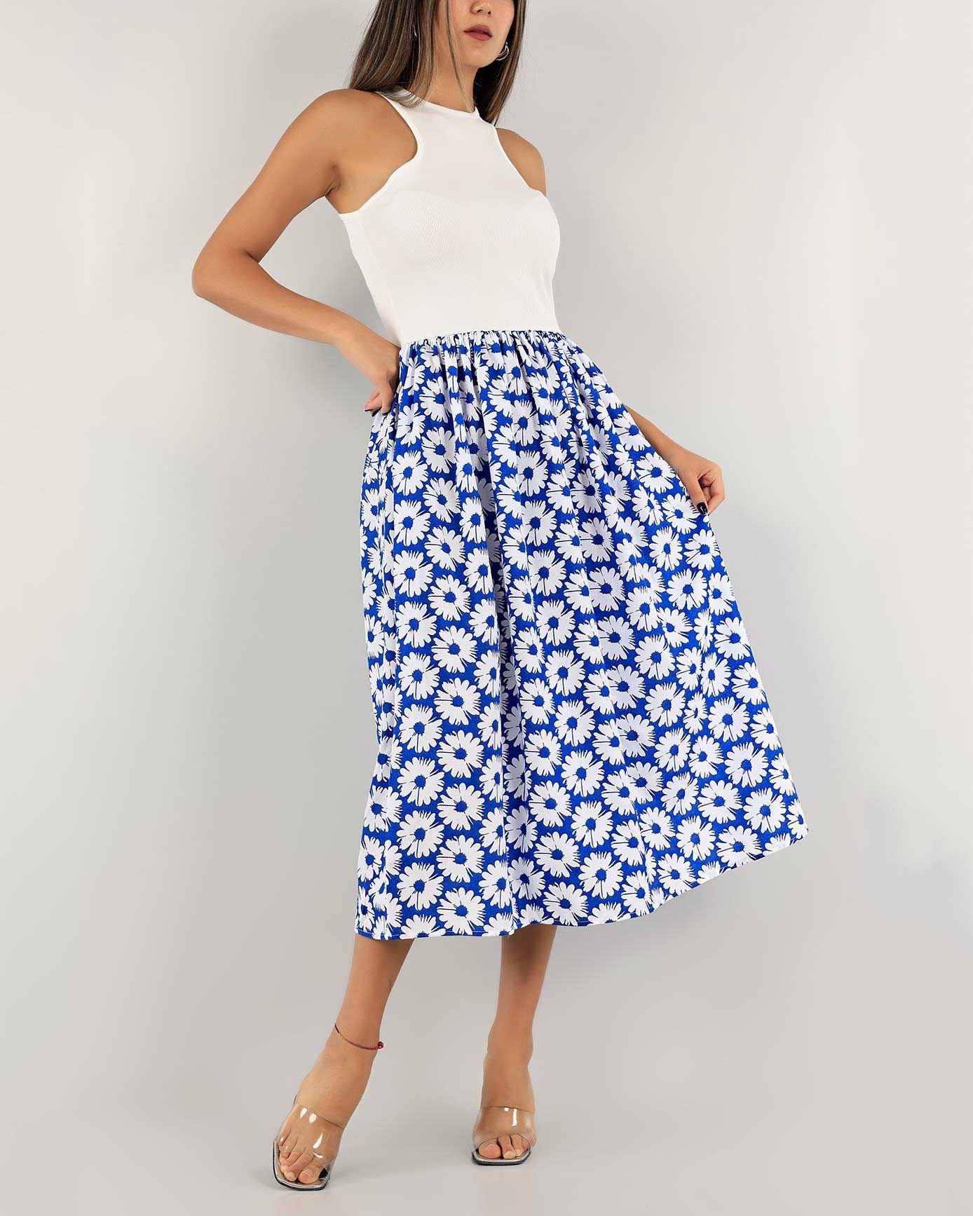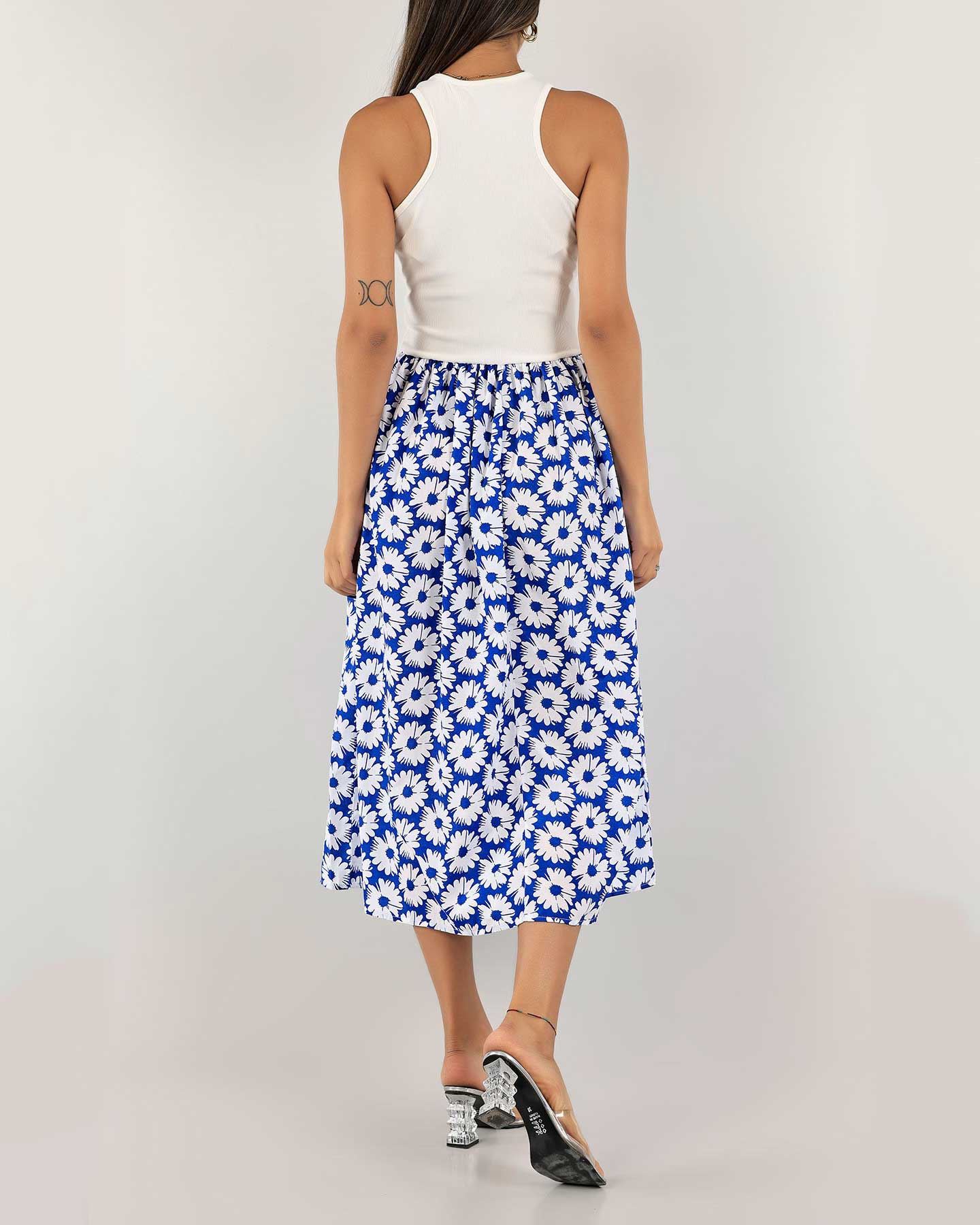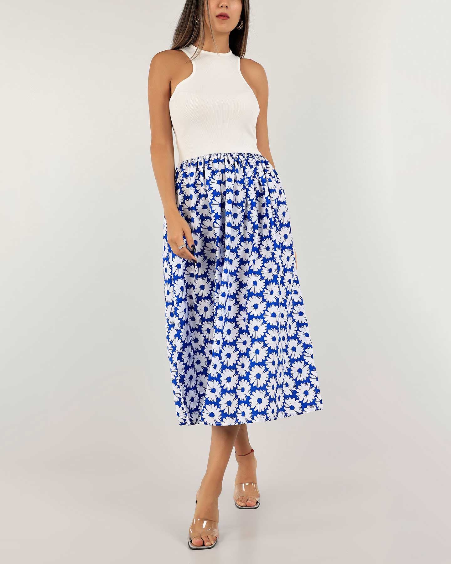 Saks Mavisi Eteği Desenli Dokuma Elbise ELB935